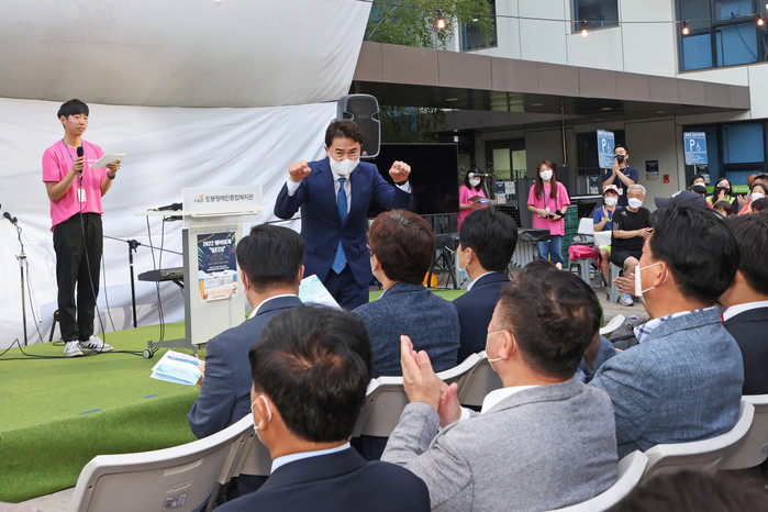 서울 도봉구 도봉장애인종합복지관은 최근 지역내 장애인과 비장애인이 함께 즐기는 소통의 장(場)인 행복하계(夏鷄) ‘WITH’ 행사를 개최했다. 행사는 도봉구립소년소녀합창단의 합창, 지역예술인들의 축하공연, 지역주민과 함께하는 버스킹 등이 진행됐다. 사진은 오언석 구청장(가운데)이 수어로 인사를 하는 모습. (사진제공=도봉구청)