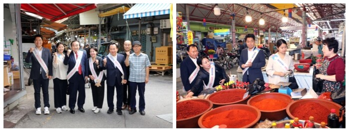| ▲ 중구의회 국민의힘 의원들이 추석을 맞이해 중부시장(왼쪽), 중앙시장(오른쪽)을 방문했다.(사진=중구의회 제공) |