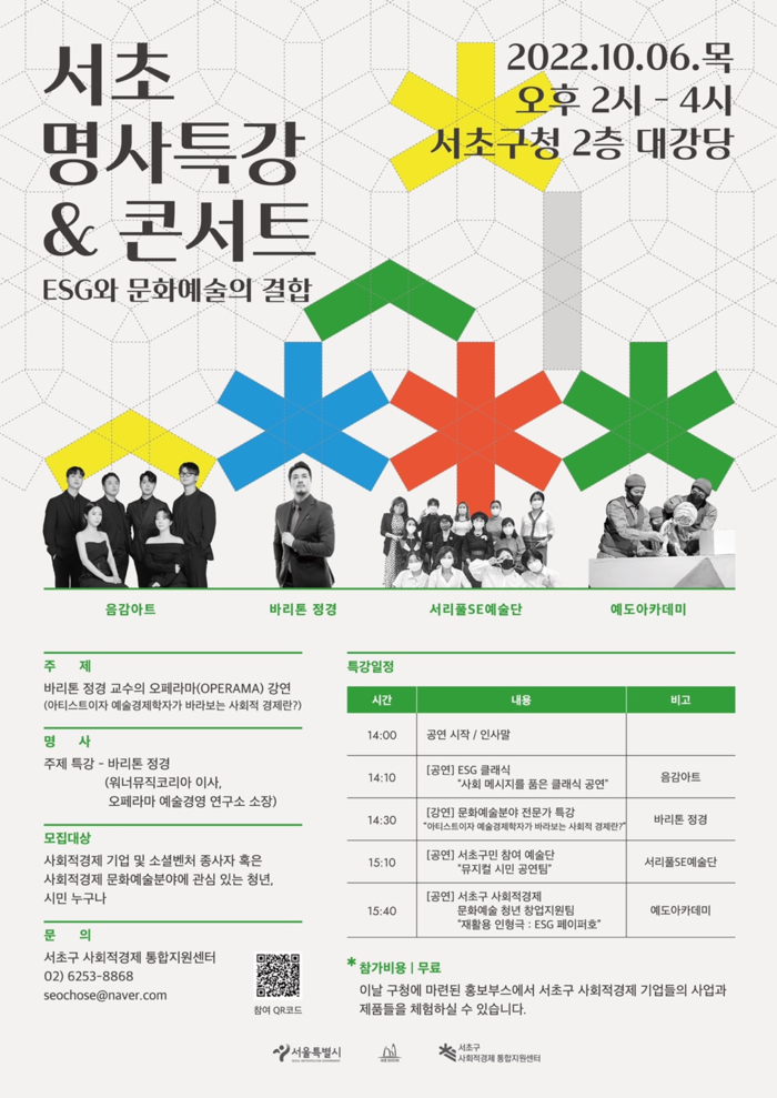 특강에선 문화예술계 명사 바리톤 정경이 예술경영과 사회적경제에 대한 통찰을 전한다. 특강 뿐 아니라 서초지역 청년 문화예술가들이 꾸민 ESG메시지를 담은 공연 무대도 진행된다.
