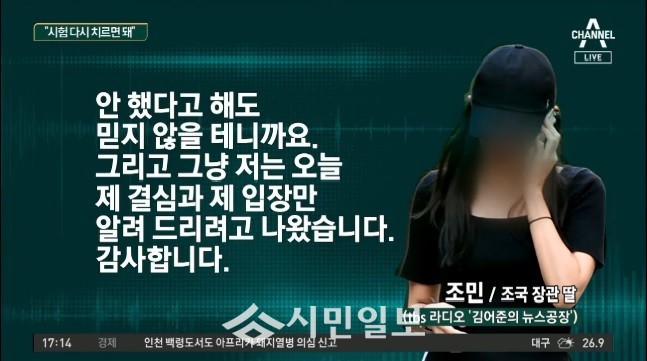 지난 10월 4일 조국 법무부장관의 딸은 tbs 라디오 '김어준의 뉴스공장'에 출연해 "고졸이 돼도 상관없지만, 어머니(정경심 동양대 교수)가 하지 않은 일을 저 때문에 책임지는 것을 견딜 수 없다"고 밝혔다.