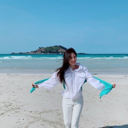환한 미소가 밝은 에너지를 자아내 눈길을 사로잡는다. 흰 와이셔츠와 청바지만 입어도 청순한 미모가 돋보여 팬들에게 감탄을 안겼다.