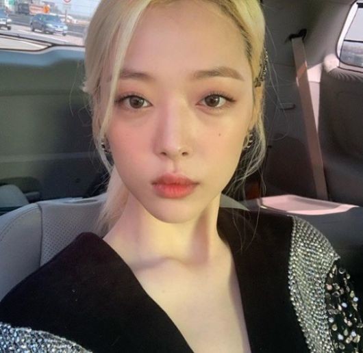 공개된 사진 속 설리는 차량 안에서 셀카를 찍고 있다. 무표정으로 살짝 멍한 듯한 표정을 짓고 있음에도 복숭아 같은 미모와 또렷한 이목구비는 세젤예답다. 금발머리가 잘 어울린다.