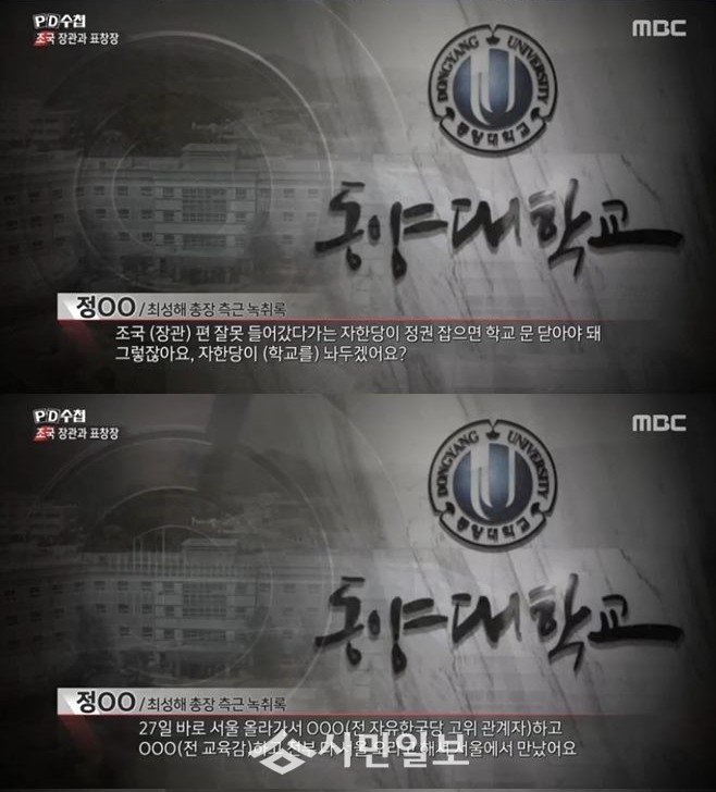 이 가운데 제작진은 동양대학교 총장 측근의 목소리가 담긴 녹취록을 입수했다. 측근은 “편 잘못 들었다가는 자유한국당이 정권 잡으면 학교 문 닫아야 된다. 자유한국당이 학교를 그냥 놔두겠냐”라고 말했다.