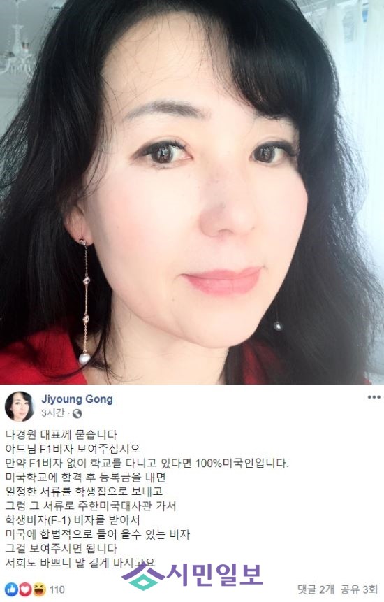 공지영 작가는 지난 9월 23일 자신의 SNS를 통해 “나경원 대표께 묻는다”로 시작하는 글을 올리고 “아드님 F1비자를 보여달라. 만약 F1비자 없이 학교를 다니고 있다면 100% 미국인”이라고 주장했다.