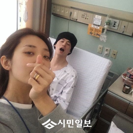 사진에는 환자복을 입은 김원중과 손하트 포즈를 취하고 있는 아내 곽지영의 모습이 담겨 보는 이의 시선을 사로잡았다.