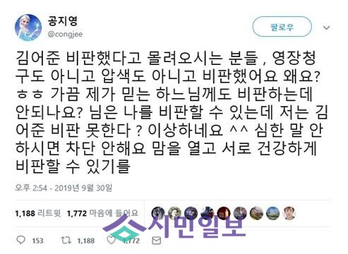 공지영 작가는 “김어준 비판했다고 몰려오시는 분들, (저는) 영장 청구를 한 것도 아니고 압수수색도 아니고 비판했다”면서 “제가 믿는 하느님도 가끔 비판하는데 (김어준을) 비판하면 안 되는 것인가”라고 반박했다. 이어 공 작가는 “(김어준) 님은 나를 비판할 수 있는데 나는 김어준을 비판 못한다는 것인가. 이상하다”며 “심한 말 안 하면 (나를 비판한 사람을) 차단 안 한다. 서로 건강하게 비판하길 바란다”고 덧붙였다.