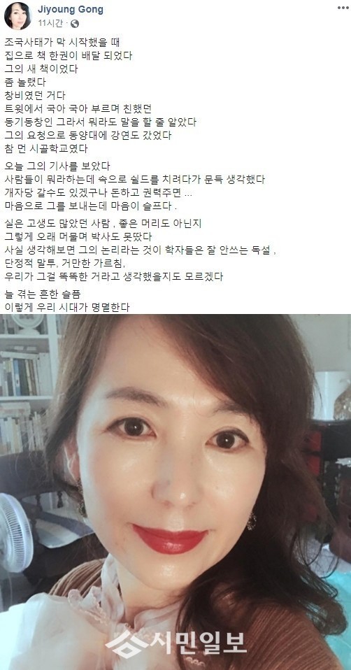 공지영은 이어 "실은 고생도 많았던 사람, 좋은 머리도 아닌지 그렇게 오래 머물며 박사도 못 땄다"면서 "사실 생각해보면 그의 논리라는 것이 학자들은 잘 안 쓰는 독설, 단정적 말투, 거만한 가르침, 우리가 그걸 똑똑한 거라고 생각했을지도 모르겠다"고 언급했다.
