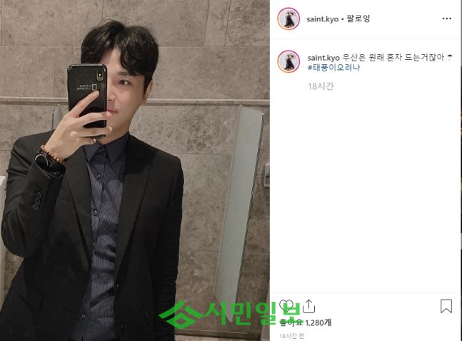 글에서 수트차림의 김상교씨는 거울 셀카를 남기며 '우산은 원래 혼자 드는 거 잖아'라고 적었다.