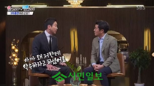 이를 본 김상중은 잠시 당황했지만 곧바로 신동엽을 껴안았다. 신동엽은 포옹을 하면서도 표정이 일그러져 웃음을 자아냈다.