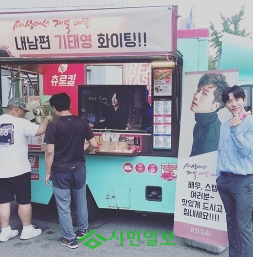 사진 속 기태영은 아내인 유진이 보낸 츄러스 차 앞에서 손가락 하트를 만들어 보이고 있는 모습으로 훈훈함을 자아냈다.