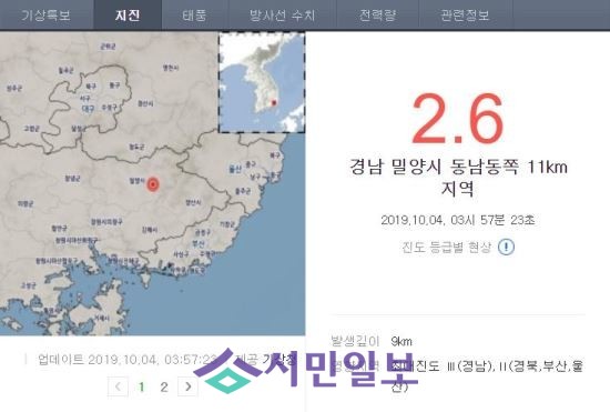 밀양시 인근에서 발생한 지진은 새벽 3시 57분에 발생했으며, 지진의 진앙은 경남 밀양시 동남동쪽 11km 지역으로, 깊이는 9km로 분석됐다.