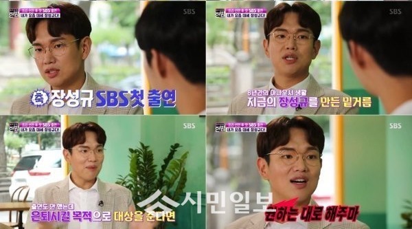 장성규는 “내가 SBS에 진출할 수 있을 것이라고 생각도 못했다. 가장 최근에 본 SBS 드라마는 ‘모래시계’(1995)고 욕심나는 건 ‘SBS 8뉴스’”라고 농담을 던졌다. 그는 “어릴 때부터 관심을 받으면 좋았다. 학창시절 내가 장난치니까 애들이 빵 터지길래 이거구나 싶었다. 그래서 늘 시도하고 실패하면서 다듬어져왔다”고 털어놨다. 그러면서 “8년의 아나운서 활동은 방송인 장성규를 만들어준 밑거름이다. JTBC 개극 당시 11개 프로그램을 정도를 동시에 했다. 지금도 프로그램 수는 비슷하다. 연봉은 달라졌다. 그것까지 비슷했으면 다 죽여버렸을 것”이라고 농담했다.