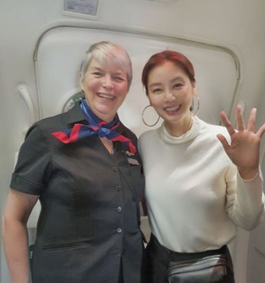 공개된 사진 속 김성령은 기내에서 오랜 경력의 외항사 스튜어디스와 인증샷을 찍고 있는 모습이다. 이어진 사진 속 김성령은 선글라스와 링 귀걸이를 착용해 스타일리쉬함을 뽐내고 있다.