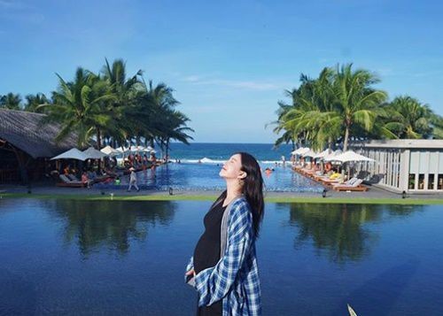 이어 공개된 사진 속 그는 만삭의 배를 감싸안고 환한 미소를 짓고 있다. 그는 휴가지에서 여유로운 시간을 보내며 예비 엄마로서 시간을 보내고 있는 모습이다.