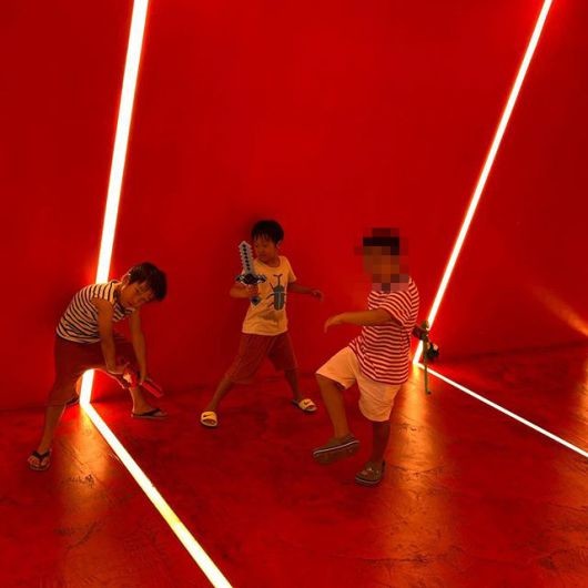 사진에는 빨간 벽과 바닥을 배경으로 장난감 칼을 든 쌍둥이 서언, 서준이와 친구 아이가 함께 다채로운 포즈를 취하고 있다.