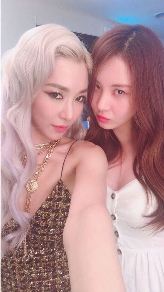 게재된 첫 번째 사진 속 서현은 공연 의상을 입은 티파니와 포옹을 하며 함께 웃고 있다.