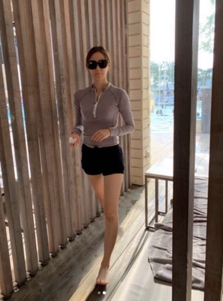 손태영은 7일 자신의 인스타그램에 "방학주간"이라는 글과 사진을 게재했다. 공개된 사진 속 손태영은 래시가드에 짧은 수영복 바지를 입고 있다.