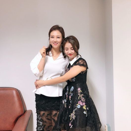 장윤정은 설하윤의 허리에 손을 두르고 환하게 웃으며 손가락 하트를 하고 있다. 두 사람은 KBS 1TV '가요무대'에서 만난 것으로 알려졌다.