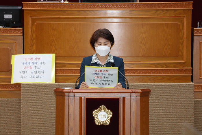 국민의힘은 기자회견문을 통해 "중앙정치와 지방의회를 구분하지 못하는 무지에서 나온 최 의원의 저급한 행위에 대해서 지방의원의 자질과 자격을 갖추었는지에 대한 비판과 함께 더 모범을 보여야할 시민사회단체장 출신으로 일말의 양심이 있다면 시의회를 더 이상 망가트리지 말고 자진사퇴를 촉구하는 목소리도 나오고 있는 상황"이라며 최 의원을 강력 규탄했다.