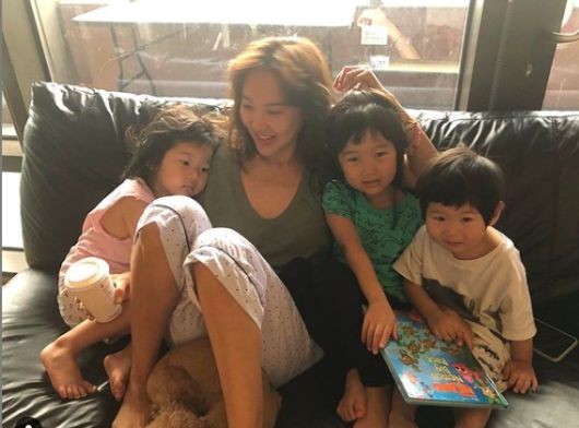 사진 속 유리는 소파 위에서 두 딸, 아들과 함께 여유로운 시간을 보내고 있다. 아이들을 향한 유리의 눈빛, 그리고 아이들의 천진난만한 모습이 사랑스럽다.