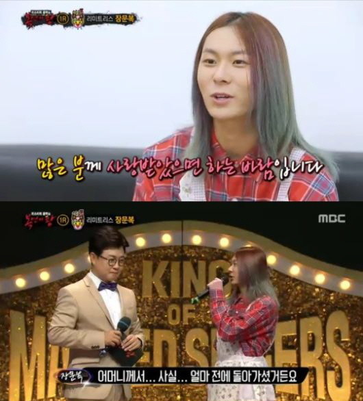 장문복은 ' 복면가왕'에 꼭 나오고 싶었다고. 장문복은 "하늘에 계신 어머니께 나온 모습을 보여드리고 싶었다. 최근에 어머니가 돌아가셨다. 2년 전 암투병을 하셨다. 하늘에서 제 모습을 봐주실거라 생각한다"고 말해 눈물 짓게 했다.
