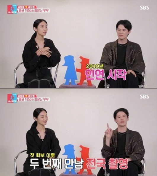 이날 김원중-곽지영 부부는 러브스토리를 공개했다. 김원중은 곽지영과 화보를 촬영할 때 이 여자라는 확신을 했다고 전했다. 당시 사진 찍는 역할을 하면서 카메라 앵글 속 곽지영을 봤는데 빛이 났다고. 김원중은 이후 곽지영의 집으로 매일 출근하며 마음을 두드렸다고 털어놨다.