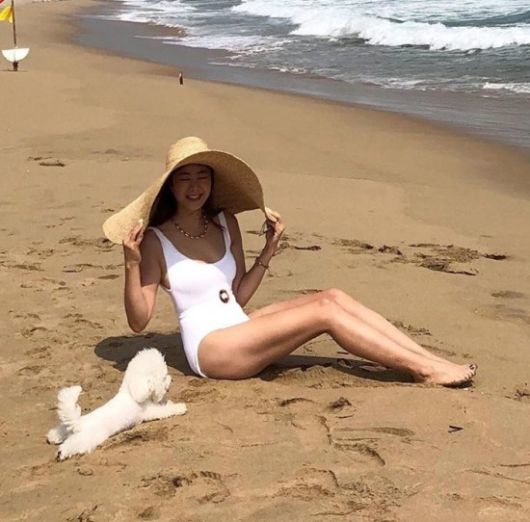 공개된 사진 속 김주희 아나운서는 반려견과 함께 해변에서 인증샷을 찍고 있는 모습. 화려한 수영복 자태가 시선을 사로잡는다.
