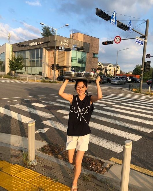 공개된 사진은 편안한 옷차림을 한 메이비가 냉면그릇을 든 채 횡단보도를 건너고 있는 모습이다.