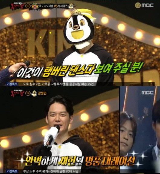 한편 황제펭귄의 정체가 공개됐다. 황제펭귄은 본인이 준비한 솔로곡 ‘그땐 그랬지’를 부르며 가면을 벗었다. 황제펭귄의 정체는 그룹 우노 출신 배우 강성민이었다. 강성민은 “저를 바꾸고 싶다는 생각에 예전에 제가 아닌 모습으로 보여드리고 싶었나보다 이름도 그래서 바꿨는데 예전의 저도 저이고 앞으로의 저도 저라는 생각에 원래 이름으로 돌아왔다”라고 말했다. 강성민은 그룹 우노 당시 나레이션 담당이었다면서 “노래 전곡을 불러본 게 복면가왕이 처음일 거다”라면서 웃었다. 강성민은 “아무래도 늘 실장님 역할을 했었기 때문에 도전하는 모습을 보여드리고 색다른 역할을 해보고 싶다”고 말했다.