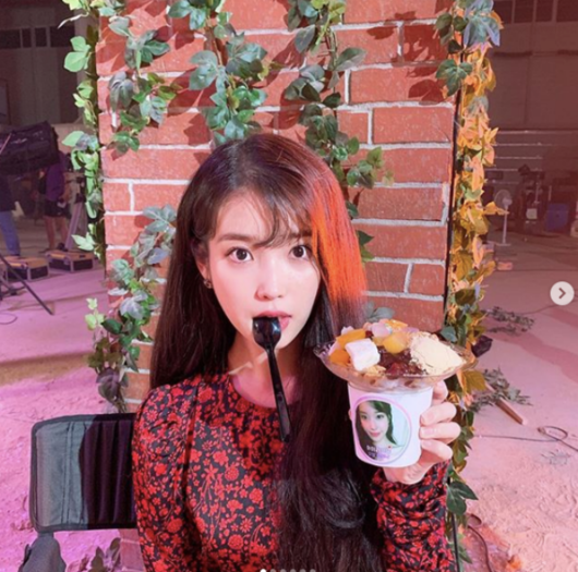 공개된 사진에서 아이유는 팬들이 보내준 간식을 손에 들고 기뻐하고 있다. 아이유는 드라마 촬영 중 팬들의 응원을 받으며 힐링하고 있는 모습이다. 아이유의 또렷한 인형 미모를 돋보이게 해주는 붉은색 원피스도 눈에 띈다.