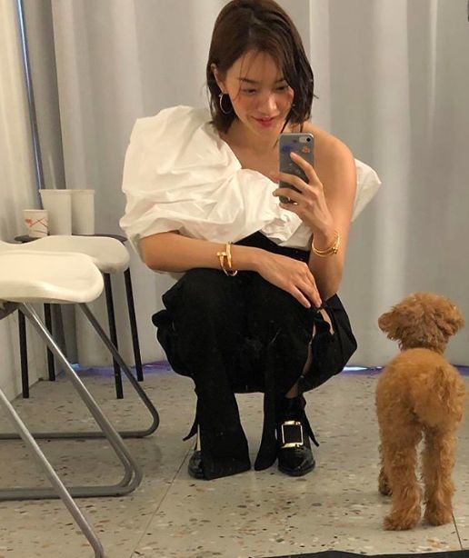 공개된 사진을 보면 신민아는 화이트 컬러의 오프숄더 블라우스, 블랙팬츠를 매치한 시크한 패션을 소화했다. 눈길을 끄는 점은 반려견을 촬영장에 데려갔다는 것.