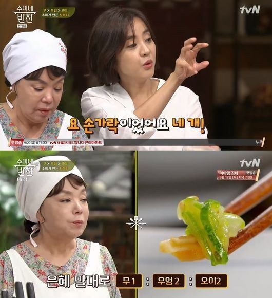 장동민은 "오이와 무와 우엉을 같이 먹으니까 새콤하고 짭조름한데 깨가 고소하다. 다양한 맛이 난다"고 말했다. 최현석 셰프는 "여기에 단맛이 나는 재료는 넣지 않냐"고 물었다. 김수미는 "단맛 재료를 넣으면 안된다"고 말했다.