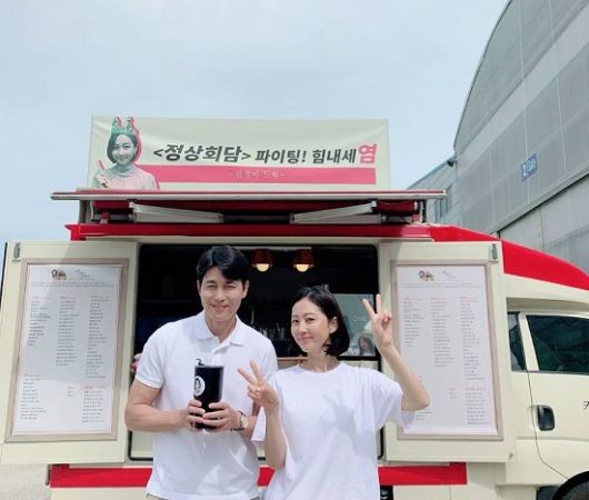 염정아가 정우성의 영화 촬영장을 방문해 커피차를 선물했다.