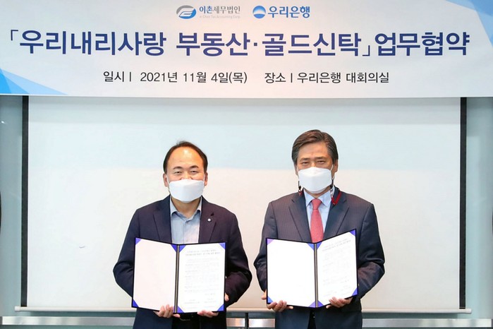 [시민일보 = 홍덕표 기자] 우리금융지주 자회사 우리은행이 지난 4일 서울 중구 소재 우리은행 본점에서 이촌세무법인과 '우리내리사랑 부동산·골드신탁 업무협약'을 체결했다.