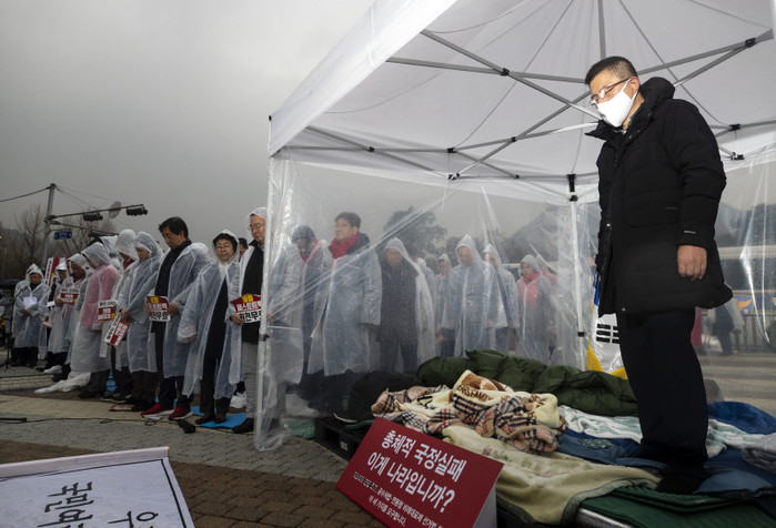 전날 단식 장소인 청와대 분수대 앞에서 열린 한국당 의원총회에는 빗방울이 떨어지는 궂은 날씨에도 원외 당협위원장 포함, 90명을 약간 밑도는 인원이 참석해 '좌파 장기 집권 저지', '공수처법 절대 반대', '선거법 절대 저지'를 한목소리로 외쳤다.