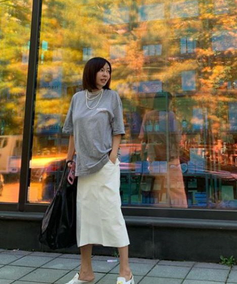 공개된 사진 속 황신혜는 회색 티셔츠에 롱 스커트를 매치, 캐주얼한 패션을 뽐내고 있다. 황신혜의 변함없는 동안 외모가 시선을 사로잡는다.
