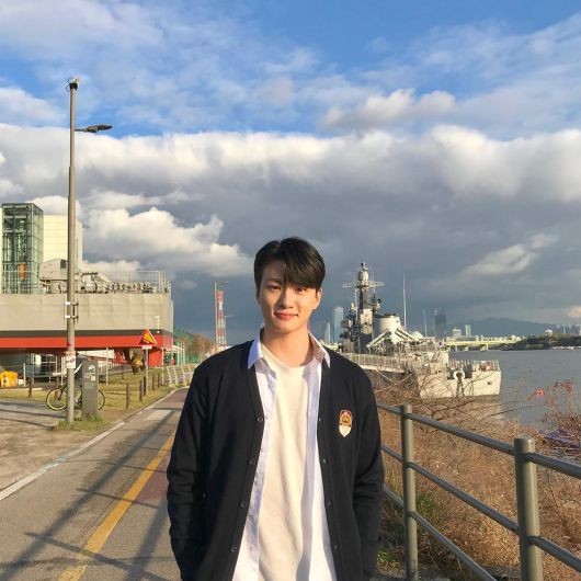 사진 속 신승호는 검은 흰티, 셔츠, 검은 가디건을 입고 강가에 서서 미소를 짓고 있다.