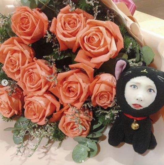 함께 올린 사진에서 홍진영은 장미꽃다발 선물을 받고 세상 행복해하고 있다. 조각 같은 옆 모습이 물오른 비주얼을 인정하게 만든다. 홍진영의 얼굴이 박힌 인형은 보너스다.