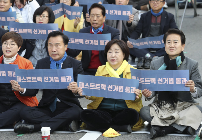 [시민일보 = 이영란 기자] 바른미래당과 민주평화당, 정의당 등 3개 야당 대표가 23일 국회 앞에서 열린 집회에 참석해 신속처리안건으로 지정(패스트트랙)돼 곧 국회 본회의에 부의될 공직선거법 개정안의 통과를 한목소리로 촉구했다.
