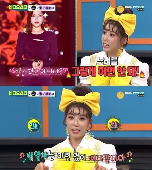 이날 비너스의 두리는 '미스트롯' 촬영 당시 송가인에게 노래를 배웠던 경험담을 이야기했다. 두리는 "송가인 언니에게 노래를 배우고 싶어서 배운 게 아니었다. 언니의 옆에 있는데 언니가 밥은 먹고 다니냐, 노래를 그렇게 부르면 안된다고 하더라"고 말했다.