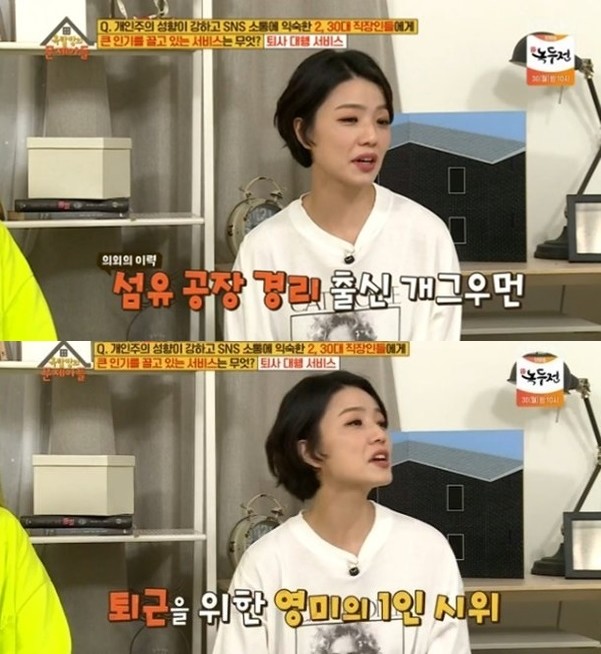 이날 김숙은 최근 20~30대 직장인들에게 큰 인기를 끌고 있는 ‘퇴사 대행서비스’ 문제를 풀던 중 안영미를 향해 “너도 퇴사한 적 있지 않아?”라고 물었다. 이에 안영미는 “과거 방직공장에서 경리로 일했다”고 말했다.