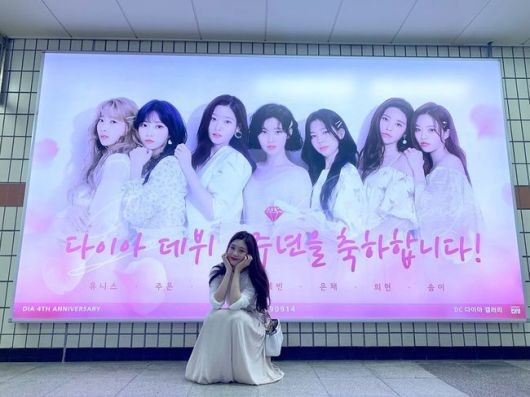 공개된 사진 속에는 다이아 데뷔 4주년을 기념해 팬들이 선물한 지하철역 광고판 앞에서 행복하게 미소를 짓고 있는 정채연의 모습이 담겨 있다. 광고판 앞에 쪼그리고 앉아 있는 모습이 사랑스럽다.