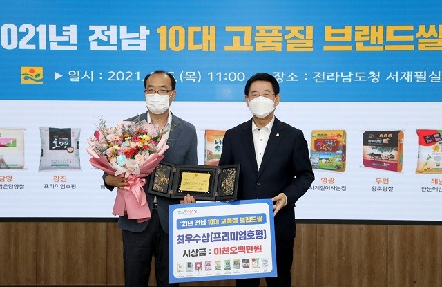 [강진=정찬남 기자] 전남 강진군은 지난 5일 전남도가 주관하는 2021년 전남 10대 고품질 브랜드 쌀 시상식에서 강진군의 ‘프리미엄 호평’이 최우수상과 함께 2,500만 원의 인센티브를 확보했다고 9일 밝혔다.