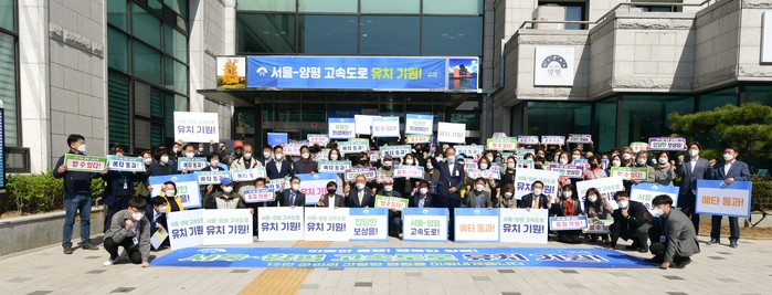 | ▲ 서울~양평고속도로 유치를 기원하고 있는 군 관계자들과 군민들의 모습.(사진제공=양평군청) |