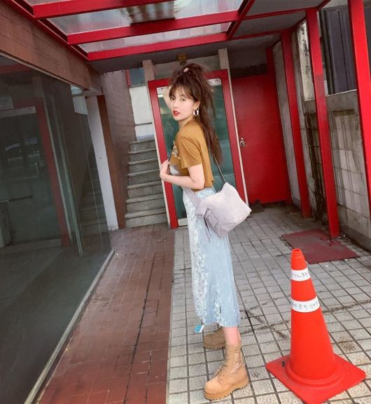 사진 속 현아는 긴 머리를 한 손으로 잡고 카메라를 바라보고 있다. 현아는 하늘색 벨벳 치마에 베이지색 티셔츠를 매치, 남다른 패션 센스를 뽐냈다.