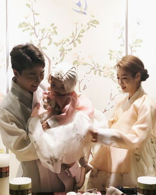 사진 속 안소미 부부는 로아 양의 돌 잔치를 위해 한복을 차려 입은 모습이다. 안소미 남편은 로아 양을 안고 환히 웃고 있고, 안소미는 딸이 입은 한복 치마를 정리하는 중이다.