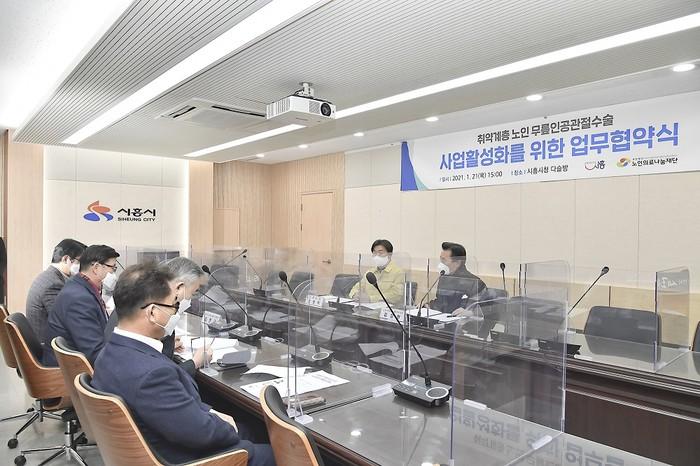 ▲ 취약계층 노인 무릎인공관절수술 사업 활성화를 위한 업무협약식. (사진제공=시흥시청) |