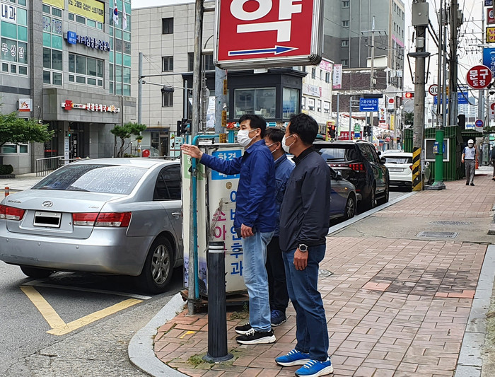 | ▲ (보도사진) 김민기 국회의원이 2020년9월30일, 진용복, 남종섭 경기도의원과 함께 신갈오거리일대에서 주민들이 요구하는 전선지중화사업 구간을 확인하고 있다 |