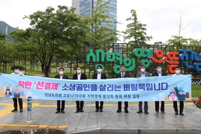전남도의회 ‘코로나19 극복 지역경제 활성화 특별위원회’(위원장 김태균, 광양)는 10일 오전 10시, 도청입구 사거리에서 ‘소상공인 희망 착한 선결제 가두 캠페인’을 전개했다.