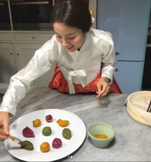 공개된 사진 속 문정원은 곱게 한복을 차려 입고 송편을 만들고 있는 중이다. '참 곱다'라는 말이 절로 나올 정도로 우아한 자태를 뽐낸다.